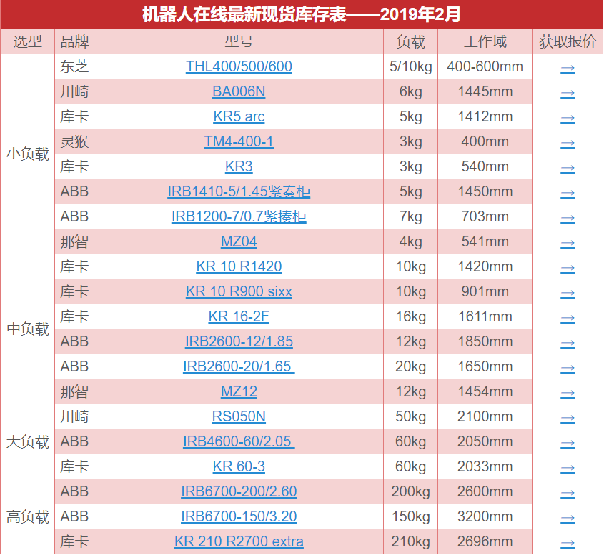 2019年2月機器人最新現貨庫存表