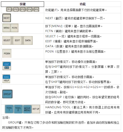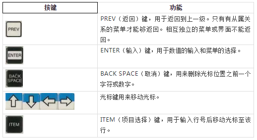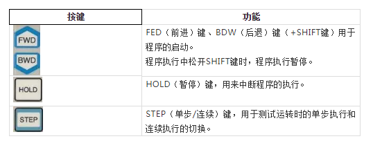 示教器按鍵由與菜單相關的按鍵、與點動相關的按鍵、與執行相關的按鍵、與編輯相關的按鍵和其他按鍵組成。