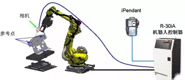 通過視覺程序調整機器人TP程序以對應實際的工件位置,只需在機器人手爪端添加一臺相機即可執(zhí)行此功能。固定工件上的3處任意的參考點的位置數據將被自動檢測并計算出補償數據。在離線編程或機器人系統搬遷后,使用此功能可極大減少機器人重新示教的時間。