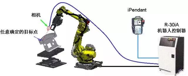 Robot-mounted 式照相機的標定可以用于如下圖所示任意位置和方向下的iRVision程序。2D狀態(tài)下的移動補償與照相機實際位置相關聯。照相機的標定可以在任意位置下進行。減少示教工作量。