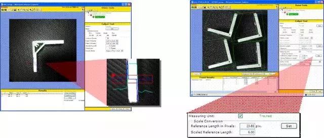 對應指定區(qū)域,偵測目標邊緣并測量兩條邊緣間長度(單位:像素pixel),乘以轉換因子可以換算為mm。可以對應目標排列及品質檢測等應用場合。